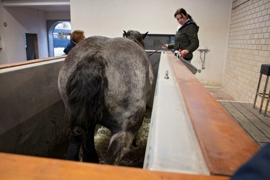 Neben der regelmäßigen Bewegung kommt auch ein spezielles Training mit dem Aquatrainer der Firma Sascotec hinzu. Dieser bietet durch die Bewegung im Wasser ein schonendes Training des Pferdes und unterstützt eine erfolgreiche Reha.